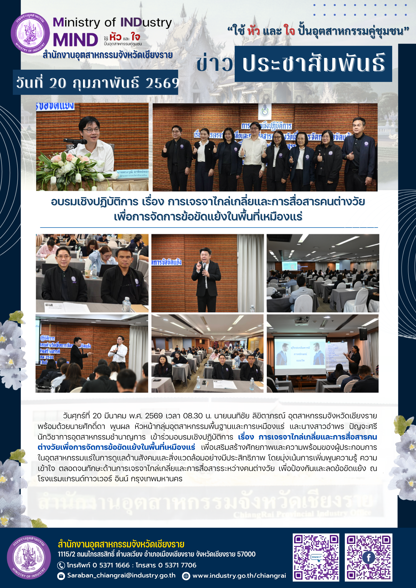 วันศุกร์ที่ 20 มีนาคม พ.ศ. 2569 เวลา 08.30 น. นายนนทิชัย ลิขิตาภรณ์ อุตสาหกรรมจังหวัดเชียงราย พร้อมด้วยนายศักดิ์ดา พูนผล หัวหน้ากลุ่มอุตสาหกรรมพื้นฐานและการเหมืองแร่ และนางสาวอำพร ปัญจะศรี นักวิชาการอุตสาหกรรมชำนาญการ เข้าร่วมอบรมเชิงปฏิบัติการ เรื่อง การเจรจาไกล่เกลี่ยและการสื่อสารคนต่างวัยเพื่อการจัดการข้อขัดแย้งในพื้นที่เหมืองแร่ เพื่อเสริมสร้างศักยภาพและความพร้อมของผู้ประกอบการในอุตสาหกรรมแร่ในการดูแลด้านสังคมและสิ่งแวดล้อมอย่างมีประสิทธิภาพ โดยมุ่งเน้นการเพิ่มพูนความรู้ ความเข้าใจ ตลอดจนทักษะด้านการเจรจาไกล่เกลี่ยและการสื่อสารระหว่างคนต่างวัย เพื่อป้องกันและลดข้อขัดแย้ง ณ โรงแรมแกรนด์ทาวเวอร์ อินน์ กรุงเทพมหานคร